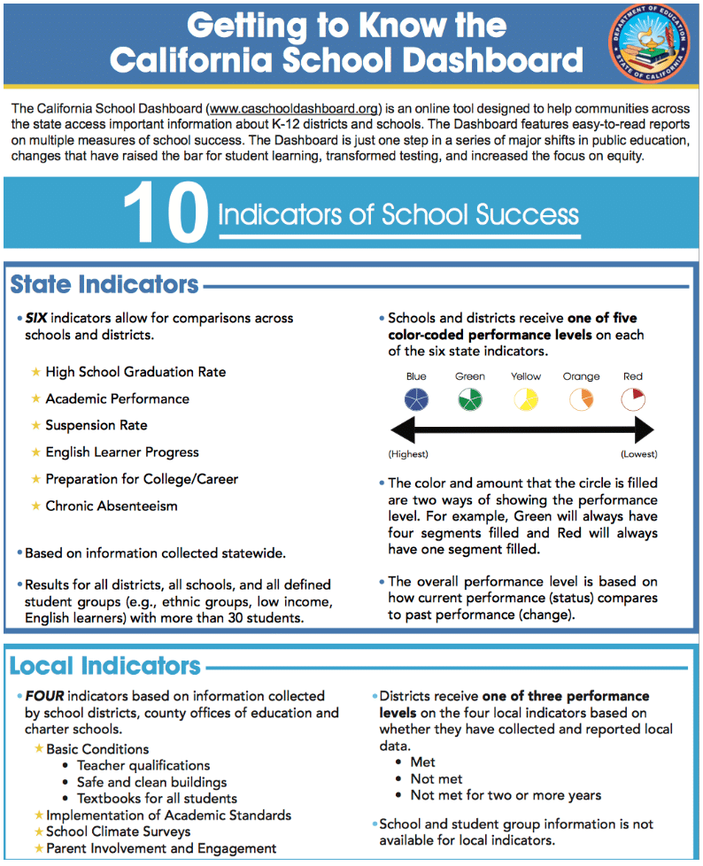 California’s dashboard on multiple measures of school success, Getting to Know the California School Dashboard: 10 Indicators of School Success, provides schools and communities with information on how students are progressing on the state’s 10 indicators of school success. Six of the indicators are common across the state and collected by the state to monitor school performance and outcomes. The other four indicators are designed and collected by local education agencies and provide district and school leaders information on non-academic factors that could influence student learning outcomes and educator capacity that’s valuable for purposes of school support, early intervention and building educator capacity.