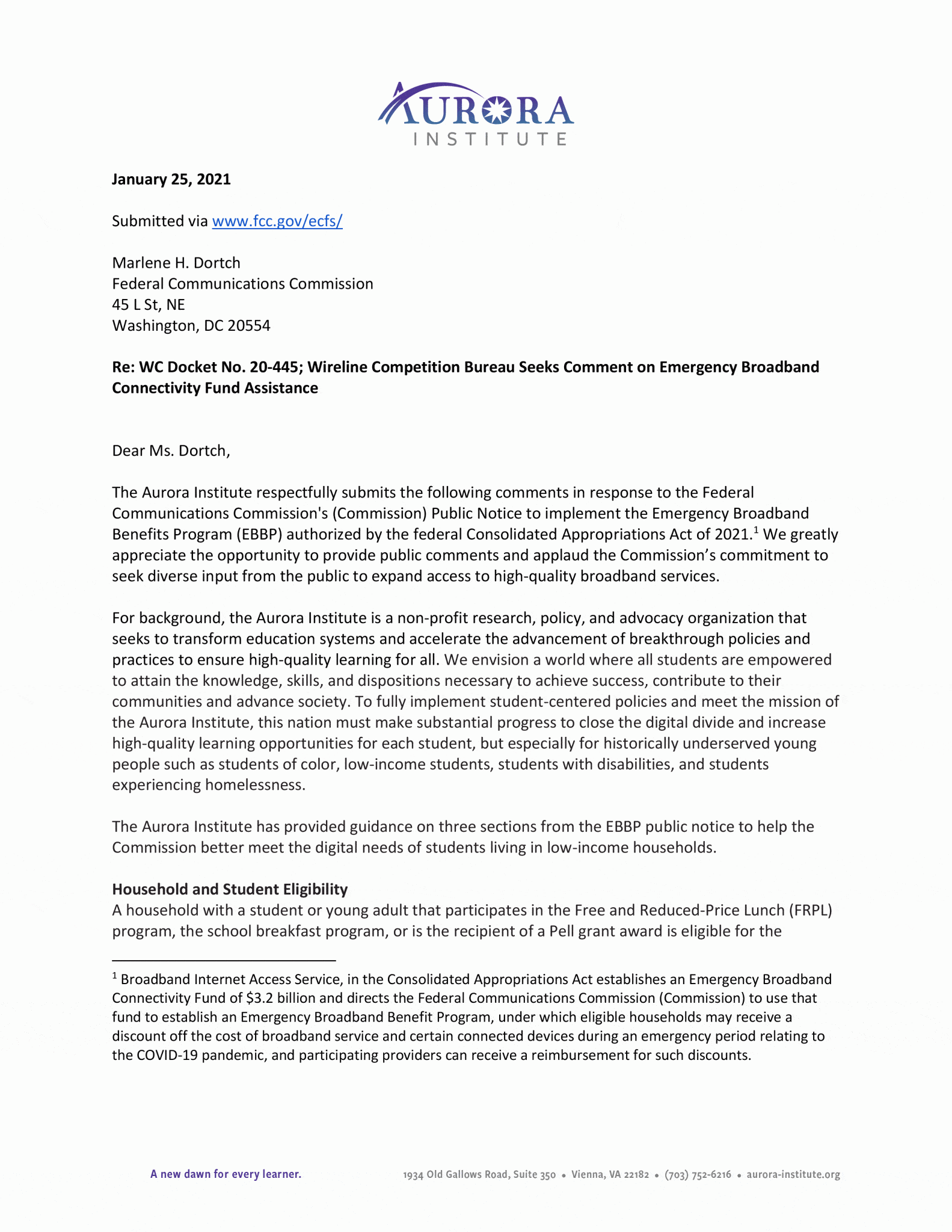 The Aurora Institute submitted a formal public comment letter to the Federal Communications Commission’s Public Notice regarding the implementation of the Emergency Broadband Benefit Program (EBBP). The FCC requested input on how best to structure and administer the new $3.2 billion program to support internet access by and the supply of connected devices to households living on low incomes.